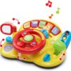 Buckle up! This dynamic toy driver invites toddlers into imaginative role-play with a turning steering wheel, interactive vehicle buttons and a signal lever, all designed to mimic the excitement of real driving. Little ones can explore animal sounds, vehicle noises, and catchy melodies like “Row, Row, Row Your Boat” across three modes: Animal, Driving, and Music. Honk the greenhorn button to introduce road safety with red, yellow and green lights. Shift gears by pushing forward or pulling back to add fun sounds, phrases, and the concept of opposites. Use the signal lever to navigate right and left to explore the town. This sturdy toy is ready for everyday adventures, perfect for little ones eager to steer their way into pretend play and help sharpen motor skills—no license required! Intended for ages 6-36 months. Requires 2 AA batteries. Batteries are included for demo purposes only. New batteries are recommended for regular use.